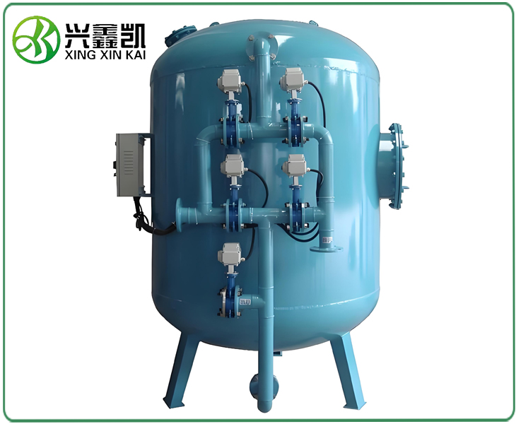 多介质过滤器利用石英砂、无烟煤作为过滤介质。该滤料具有强度高,寿命长,处理流量大,出水水质稳定可靠的显著优点,石英砂的功能主要是去除水中悬浮物、胶体、泥沙、铁锈。采用水泵加压,使原水通过过滤介质,去除水中的悬浮物,从而达到过滤的目的。
